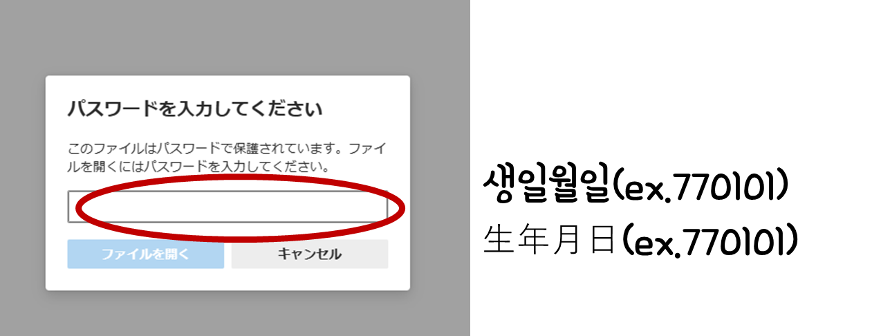 | 7. 다운로드한 PDF 파일을 열면 "패스워드를 입력해 주세요"라고 표시되요! 패스워드는 본인의 생년월일 6자리 숫자를 입력하시면 파일 내용 확인할 수 있어요. |
