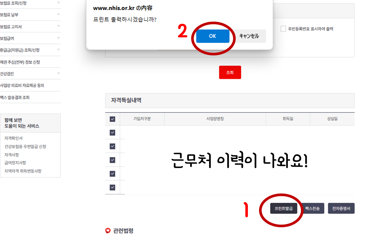 | 4. 밑에 있는 자격득실내용이 표시됩니다. | 여기서, 지금까지 직장에 근무한 쪽이나, 배우자의 회사에서 건강 보험을 부담하고 있는 피부양의 내용이 모두 표시됩니다. |